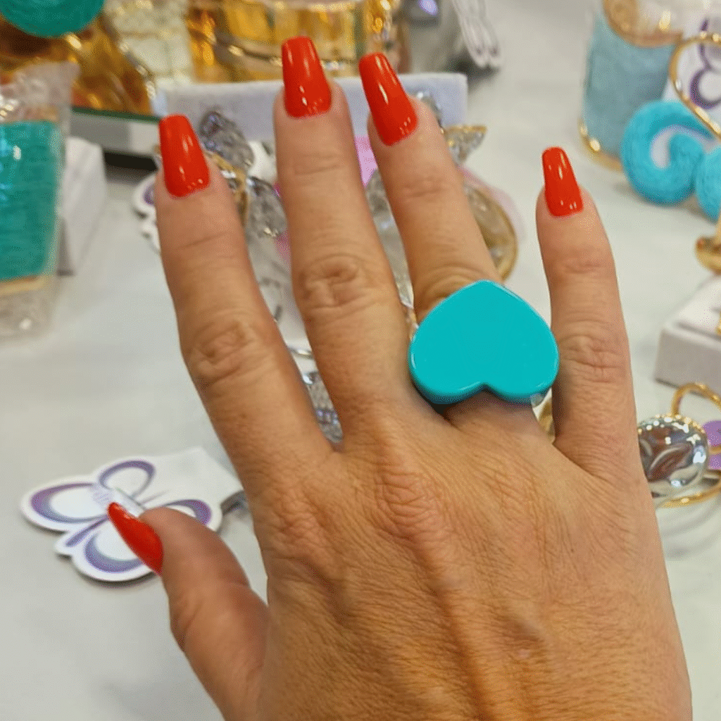 Este anel com aplicação em formato de coração na cor turquesa é perfeito para trazer um toque moderno e romântico ao seu visual. O design marcante valoriza as mãos e combina tanto com looks casuais quanto com produções mais ousadas.